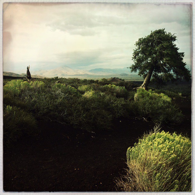 When I rolled into Craters of the Moon National Monument is was blowing up a gale and raining sideways. The thought of setting up my tent in that was…unpleasant. A chat with the rangers and drive around the park in my nice dry, warm car (Lady Bird) was much more appealing. So that’s what I did. The rain let up about the time I got close to something called the Inferno Cone. I had to look twice at the park map to make sure I was actually going to hike up something called an “inferno cone.” Yes, indeed. Glad the rain let up, and I took that walk! When I got to the top, this is what I found.