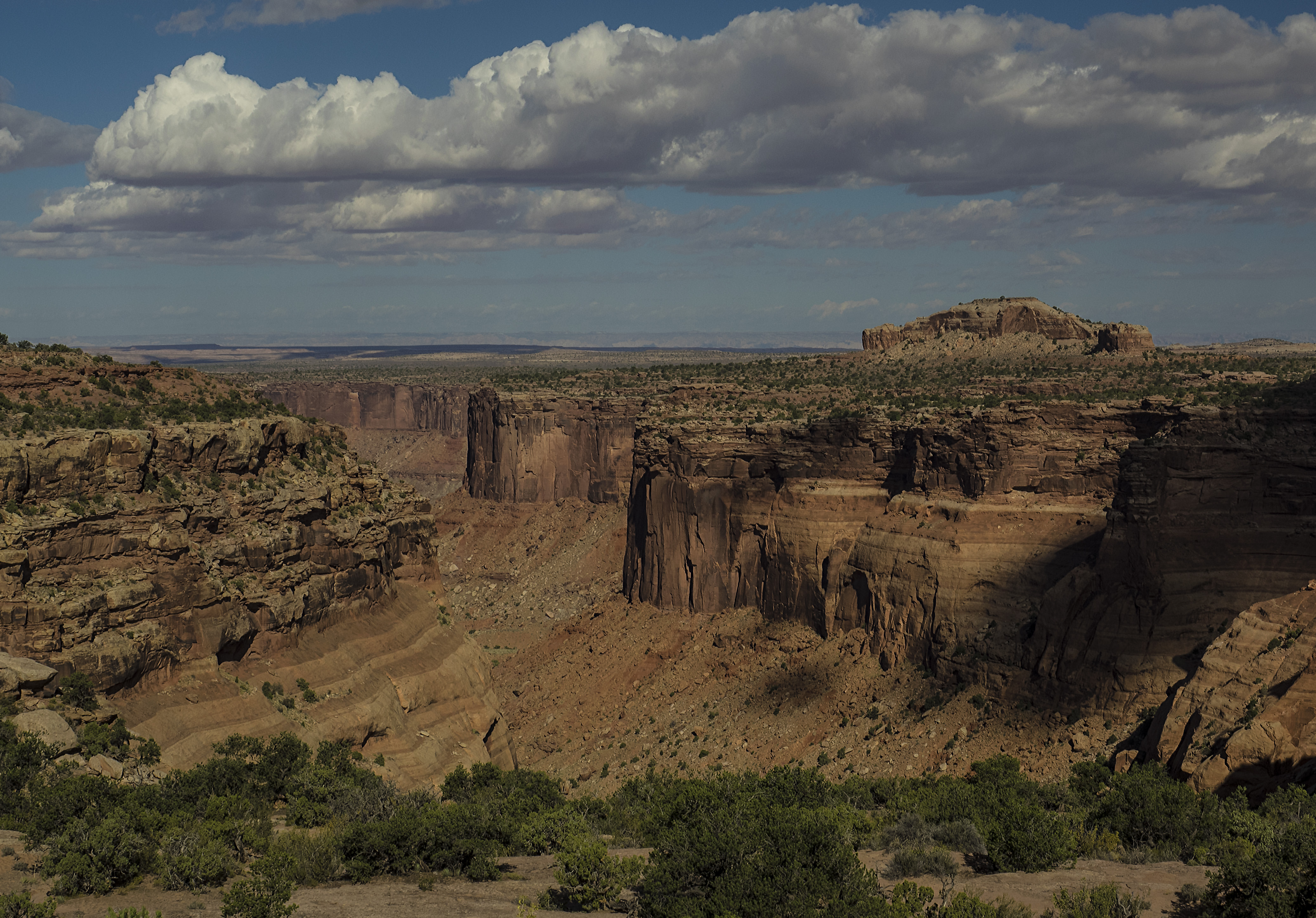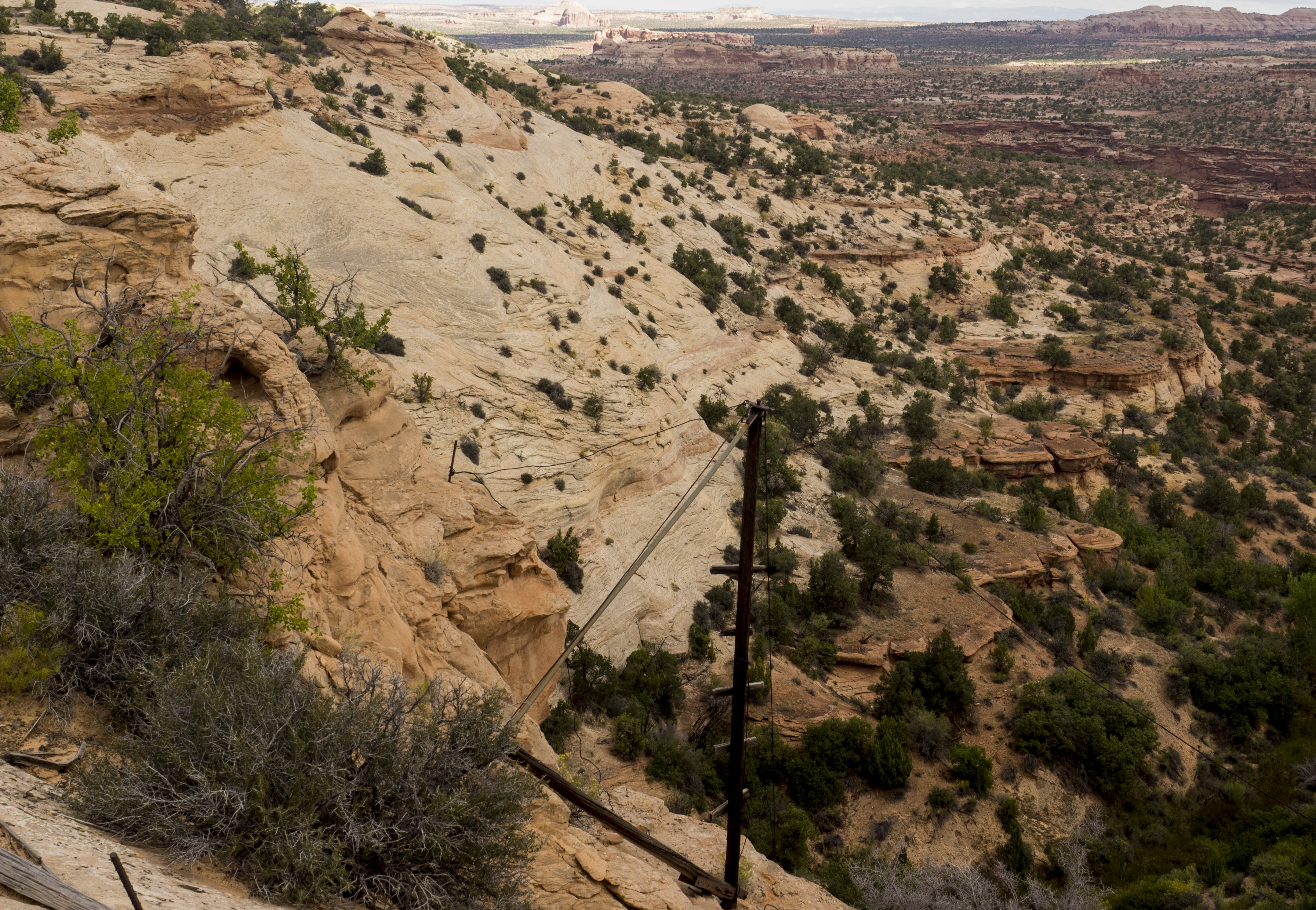 I strode out onto a ledge for a look into Taylor Canyon, gripped my way up the sandstone slabs to gain the mesa top again and finished off the hike in a spattering of rain next to Shafer Canyon.